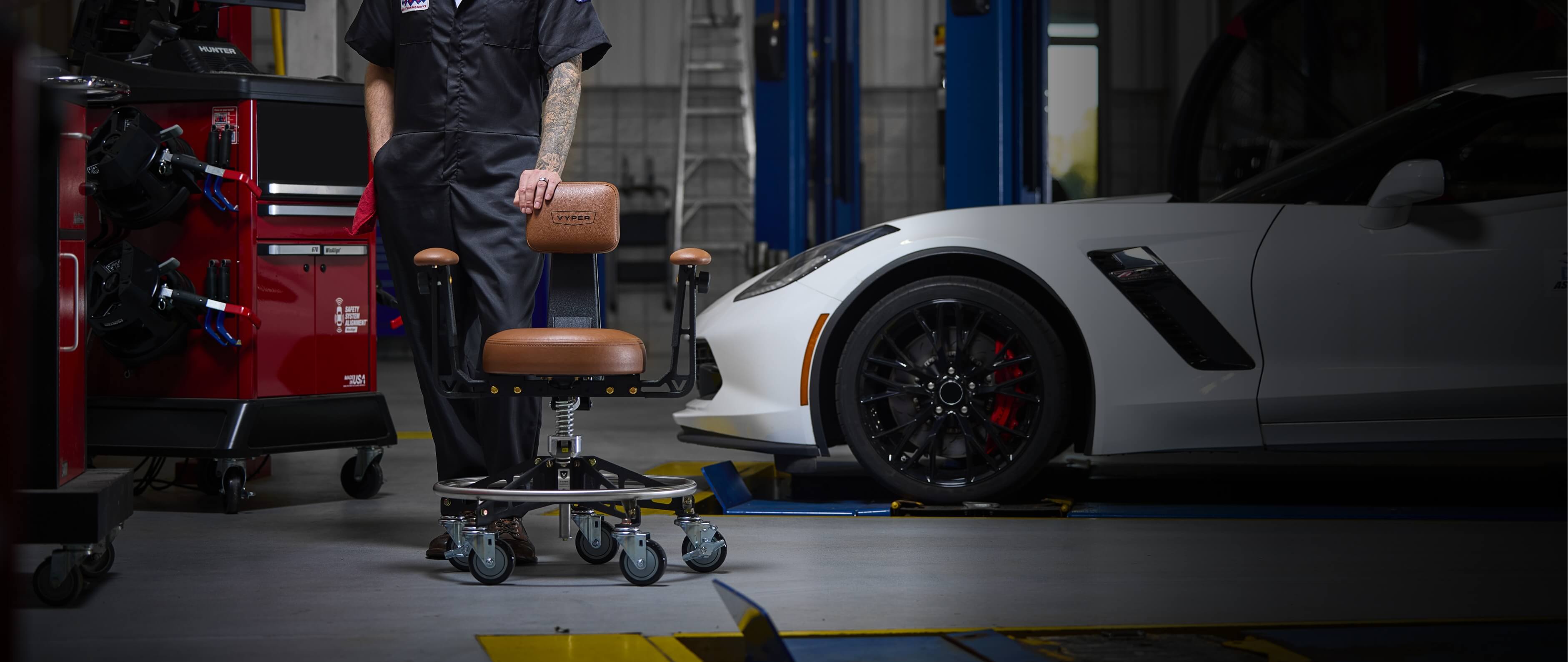 The Vyper Chair is used & trusted by professional auto enthusiasts, detailers, welders, fabricators, woodworkers, artists & hobbyists every day. Trusted by Obsessed Garage, Chip Foose, Jay Leno, Adam LZ, Gas Monkey Garage and more.